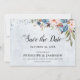 Casamento botânico floral azul empoeirado salve o cartão de data com buquês elegantes de marinho/Azul empoeirado, branco, esbranquiçado, rosa de pêssego e folhas verdes de eucalipto. Entre em contato comigo para obter ajuda sobre a personalização ou se você precisar de outro produto com este design.