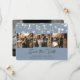 Elegante foto de casamento azul empoeirada salve o cartão de encontro. Nosso casamento salvou a data com uma colagem de fotos de 3 imagens contra um fundo azul empoeirado, enfeitado com luzes de cordas na frente e uma foto na parte de trás. Personalize facilmente este azul empoeirado salve o cartão de data com as suas fotos e detalhes do casamento.