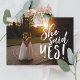 "Ela disse SIM!" em letra de estilo manuscrita sobre sua foto de sangria de cheio. Personalize a cor do gráfico e do backer para corresponder aos detalhes do seu casamento; excelente para salvar a data ou um anúncio ou festa do noivado.