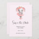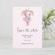 Salve o cartão de data com uma ilustração adorável. Um elefante de menina cinza com tutu rosa e balé de dança de flores, na ponta.