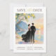 This design features a charming scene set on the Amalfi Coast, Italy, where a couple is illustrated in a digital style surrounded by Mediterranean lemon trees, vibrant green leaves, and the warm, romantic atmosphere typical of southern Italy. The yellow and green tones blend with a chic, contemporary aesthetic, creating a harmonious composition that conveys the joy and elegance of announcing your wedding date with an unmistakable Italian touch.