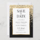 Elegant black and gold wedding save the date card featuring wedding details inside a gold frame adorned with gold confetti. Matching items available.