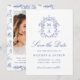 Announce your wedding date with classic sophistication using this blue monogram save the date card. The front features your personalized monogram initials framed by an ornate crest of detailed chinoiserie and baroque-inspired motifs, creating a timeless and refined focal point. “Save the Date” is displayed in elegant calligraphy, with your names, wedding date, and location presented below in traditional serif lettering. On the back, your vertical engagement photo is showcased inside a white frame, with space beneath to include your wedding website and QR code for easy guest access. A blue and white chinoiserie floral pattern with Victorian elegance completes the design, offering a polished and heirloom-style finish ideal for formal or classic wedding celebrations.