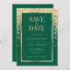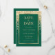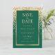 Elegant emerald green and gold wedding save the date card featuring wedding details inside a gold frame adorned with gold confetti. Matching items available.