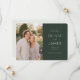 This wedding save the date card features a modern and elegant design with a split layout, combining a soft, natural photo on the left with crisp typography on the right. The color palette includes warm greens and sunlight hues, transitioning to a deep forest green background that highlights the white text. The clean lines and smooth gradients create a sophisticated yet approachable feel, perfect for announcing your special day. Customizable placeholders allow you to personalize the names, date, and location, ensuring it reflects your unique celebration.
