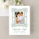 Announce your wedding with this elegant green ornate frame photo save the date, showcasing a hand-drawn antique picture frame around the couple’s vertical engagement photo. “Save the Date” appears in graceful calligraphy, paired with classic serif lettering for the couple’s names, wedding date, and location. The back features a horizontal photo with space below for custom wording and a QR code, making it easy for guests to visit your wedding website. This personalized photo save the date blends natural elegance with modern functionality for a refined wedding announcement.