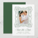 Announce your wedding with this elegant green ornate frame photo save the date, featuring a hand-drawn antique picture frame that surrounds the couple’s vertical engagement photo. “Save the Date” is displayed in graceful calligraphy, paired with classic serif lettering for the couple’s names, wedding date, and location, creating a refined and balanced layout. The green frame adds a natural, grounded tone while maintaining a timeless, artistic feel that works beautifully across both traditional and modern wedding styles. Ideal for classic weddings, black tie ceremonies, and elegant venues, this personalized photo save the date offers a polished way to share your wedding date.