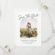 This elegant yet modern wedding save the date card features modern script, classic typography, and a rustic photo frame that accommodates one square photo. All colors of this design are customizable, including the background, script, and text colors.