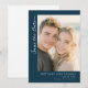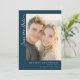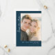 This wedding save the date card features a modern and elegant design with a deep navy blue background on one side, complemented by a large photo placeholder showcasing a couple. The layout is clean and sophisticated, with ample negative space enhancing its visual appeal. The typography includes stylish cursive for "Save the Date" and bold serif fonts for customizable details, creating a timeless look. Perfect for announcing your upcoming nuptials, this card conveys anticipation and formality in an inviting manner.