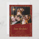 Elegante vermelho burgundy e armações de fundo de confete dourado 3 das suas fotos de casal. O texto é ouro profundo. Salvar a Data é gravada em um texto de script em negrito. 4 linhas de texto que descrevem seus planos de casamento aos seus convidados.
