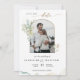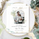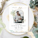 Anuncie seu casamento com esta bela foto Salve o cartão de data com uma elegante estrutura geométrica de arco com detalhes elegantes de Eucalyptus verde armando sua foto e delicadas manchas de aquarela nas laterais. Folhas de verde e manchas de aquarela numa bela mistura de tons verdes, azuis, dourados e terracotas. Voltar com manchas delicadas de aquarela nos lados e quadro circular central com detalhes verdes com nomes de casais e data. Parte da nossa coleção "Elegante Verde Eucalyptus Wedding and Events" com uma variedade de produtos coordenadores disponíveis.