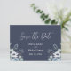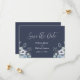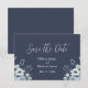 Simples cartão de “Save the Date” azul escuro e branco com flores. Os nomes são feitos em elegante letra cursiva branca. Perfeito para aquele casamento de primavera, verão, outono ou inverno.