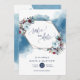Gorgeous Save the Date card com a frase "Save the Date" em caligrafia azul moderna escrita à mão, encapsulada por armação geométrica de ouro com belas pulverizações florais de canto e delicadas manchas azuis de aquarela em cascata no verso. Flores e folhagem em azul, marinho, vermelho borrado, roxo e magenta empoeirados. Capacidade de usar o cartão para qualquer evento simplesmente mudando o "casamento" na caixa de texto fornecida. Voltar com mais manchas azuis de aquarela em cascata na placa. Também disponível a mesma design com sua foto no verso. Parte de nossa coleção "Celestial Blooms" com vários produtos de coordenação disponíveis.