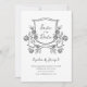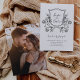 Este casamento na moda, preto e branco salvou os cartões de data apresentam uma elegante ilustração de uma crista de casamento com folhagem e flores. O texto é uma mistura de textos manuscritos de tendências e textos clássicos para um olhar caprichoso e romântico. Adicione sua foto pessoal favorita ao fundo.