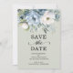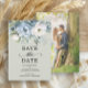Azul empoeirado e branco de aquarela floral e verde botânica de cor verde salva a data em um fundo verde sábio. Personalize com sua foto de noivado no verso. Entre em contato comigo para obter assistência com suas personalizações ou para solicitar outros produtos Zazzle correspondentes ou coordenadores para o(s) seu(s) evento(s).