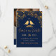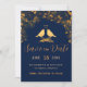 Anuncie seu casamento com estes elegantes cartões de save-the-date azul-marinho com flores douradas e pássaros que têm um fundo azul-escuro adornado com um intricado padrão de folhagens florais douradas e tipografia moderna. A combinação do azul-marinho rico e do dourado brilhante cria uma estética elegante e luxuosa. Insira sua foto e o site do seu casamento no verso.