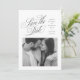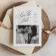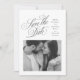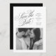 Este elegante anúncio de casamento com uma foto apresenta um belo tratamento de tipo de letra "save the date", texto personalizado simples e uma grande foto horizontal. Este lindo design de save the date é uma ótima maneira de compartilhar uma foto de noivado e contar detalhes do casamento para familiares e amigos. O verso apresenta um elegante preto combinando com pontos suaves, juntamente com uma mensagem personalizável e um código QR para o site do seu casamento. Este cartão original da Lea Delaveris Design está disponível em mais estilos e cores na coleção e também como um download digital de save the date.