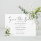 Este cartão de save the date de casamento de folhas de verdura botânica elegante pode ser personalizado com suas informações em tipografia chic com sua foto especial no verso. Projetado por Thisisnotme©