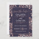 Este cartão de aviso de casamento elegante e moderno é a escolha perfeita para um evento sofisticado e formal. Ele apresenta folhas florais desenhadas à mão presas em folha de ouro rosa impressa falsa no topo de um fundo azul naval empoeirado com uma borda de rosa cor-de-rosa correspondente para a tipografia. É chique, luxuoso, simples, doce e bonito!