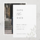 Foto de casamento personalizada salve o cartão de data com design simples moderno com folhagem verde de sábio.