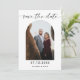 Cartão elegante para salvar a data com uma moldura de foto de arco moderno apresentando um casal elegante entre formações rochosas. Tipografia minimalista e layout limpo.