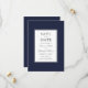 Simples e elegante, este casamento saboroso salve o cartão de data usa um simples quadro azul marinho ao redor do seu texto. Uma borda dupla fina de cinzas envolve o texto para adicionar detalhes extras ao design. Lindos emparelhamentos tipo-face de script e texto serif transmitem seus detalhes com elegância. A parte traseira da placa tem um modelo de foto para adicionar sua foto de noivado ou outra foto desejada para personalizar ainda mais a placa. Personalize o modelo de texto com os detalhes do casamento.