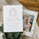 Anuncie seu próximo casamento para amigos e familiares com este cartão de "save the date" fotográfico de floral vitoriana em elegante verde-sage chinesice. Este design exibe suas iniciais de monograma cercadas por um brasão de intricada chinesice verde-sage e motivos barrocos. "Save the Date" é apresentado em um script de caligrafia verde-sage com os detalhes do seu casamento mostrados abaixo. O verso do cartão apresenta sua foto de noivado vertical com um fundo de padrão floral inspirado na chinesice verde-sage.