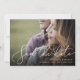 Um cartão de data moderno, projetado para acomodar sua foto favorita de noivado de sangramento horizontal ou orientada a paisagem. "Salve a data" aparece perto do fundo da sua foto em letras escritas à mão brancas, com seus nomes, data de casamento e local do casamento embaixo. O lado inverso revela detalhes adicionais de salvação da data, incluindo o site do casamento.