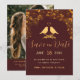 Anuncie seu casamento com estes elegantes cartões de save-the-date em burgundy e dourado que têm um fundo burgundy escuro adornado com um padrão intricado de folhagens florais douradas e tipografia moderna. A combinação do burgundy rico e do dourado brilhante cria uma estética elegante e luxuosa. Insira sua foto e o site do seu casamento no verso.