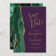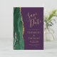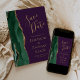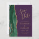 A borda esquerda deste elegante casamento moderno salve o cartão de data apresenta uma esmeralda verde aquarela agate borda com falsa brilho dourado. O texto personalizável combina manuscrito dourado, fontes em copperplate e itálico em fundo roxo profundo. O verso apresenta um design emerald verde e dourado.