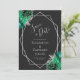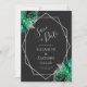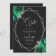 Este elegante casamento moderno salva o cartão de data apresenta uma imagem geométrica prateada decorada com buquês florais esmeraldas e prateadas em um fundo fora de preto. O texto personalizável combina a escrita manual imétrica de cinzas prateadas, a placa de cobre e as fontes itálicas. O reverso é sólido fora do preto.