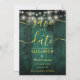 Esta elegante corda verde esmeralda ilumina madeira ruísta madeira boho cartão salva-the-date pode ser personalizado com suas informações em tipografia de ouro chico. Projetado por Thisnotme©