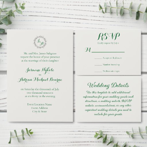 This elegant save the date card features a delicate leafy wreath monogram at the top with classic emerald script and serif typography centered on a warm ivory background, creating a timeless way to announce your wedding date in sophisticated style.