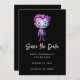 Salve o cartão de data com uma ilustração fofinha. Monstro de Frankenstein com cabelo rosa e roxo e um terno e gravata.