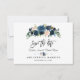 Design de cartão encantador com uma bela cor d'água cor rosa pincel e buquês de flores azuis marinhos, falso quadro de ouro sobre fundo branco; no fundo azul da meia-noite e no fundo de um buquê floral. Use a ferramenta Personalizar para adicionar suas informações e fazer alterações. Para obter itens correspondentes, visite minha Coleção Floral de Blush Azul de Marinho.
