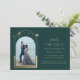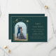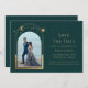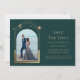 Galáxia Cósmica Célestial Salva as Datas, Astronomia Espacial da Lua Solar Dourada Verde Mística, apresenta um sol dourado, lua e estrelas num fundo verde. Dentro é a sua foto favorita e o seu personalizado salva as informações de data. Personalize editando o texto nas caixas de texto. Projetado para você por ©Evco Studio www.zazzle.com/store/evcostudio
