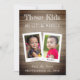 No centro há duas fotos de crianças sobrepostas - a noiva e o noivo - com bordas brancas retrógradas e os nomes escritos em suas bordas inferiores. Na parte superior, acima das fotos, há a mensagem "Essas crianças estão se casando" em letras brancas, com as primeiras palavras maiores, como escritas em giz, e na parte inferior, sob as fotos da infância, há as palavras "Salvar a Data" e a data, também em letras brancas de giz. O fundo (e o fundo) é madeira escura. As fotos marcadas de duas crianças negras pequenas são de Pixabay e são gratuitas para uso comercial. A menina negra com fitas fuchsia é de Cheryl Holt e o menino negro na camiseta fuchsia é de Nidhil 007.