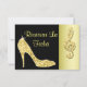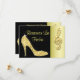 Cartões personalizados de "Save The Date" para festas de aniversário de 25 anos, elegantes e de dupla face para mulheres, com brilho e glamour. Lindo cartão "save the date" dourado e preto com uma imagem impressa deslumbrante e glamorosa com cristais, brilho, lantejoulas, diamantes, jóias cintilantes, saltos altos, sapatos de moda e clave de sol dourada brilhante sobre um fundo preto e dourado. Chic, sofisticado, fofo, feminino, moderno, cartões "save the date" para aniversários em cores da moda. Esses cartões fabulosos, elegantes, estilosos, sofisticados e bonitos são decorados / impressos em ambos os lados. POR FAVOR, NOTE: Todos os produtos na Zazzle têm imagens impressas planas.