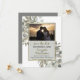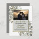 Estas cartões salve a data são uma maneira excelente de deixar seus amigos e família saberem sobre seu próximo casamento. Eles apresentam um design rústico com sua foto cercada por pinturas manuais de folhas de eucalipto e galhos de pinheiros em tons de verde-sábio e ouro em fundo de cinza. O título é escrito em uma caligrafia antiga com espaço para os nomes do casal, data do casamento, local e site.