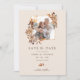 Este elegante cartão de datilografia apresenta uma bela cor d'água terracotta, marrom, e coroa floral esticada sobre fundo esticado com uma foto da noiva e noiva.