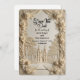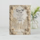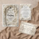 Announce your formal estate wedding with timeless elegance. This vintage-inspired design captures the romance of European architecture in a luxury cream palette. Experience the grandeur of an old-world celebration through this intricate illustration. The design centers on a symmetrical view of a majestic cathedral featuring twin spires, accessible via a tree-lined garden pathway. The central scene is framed by elaborate, digitally sculpted scrollwork and blooming rose clusters that simulate the appearance of chiseled stone or plaster relief. The typography blends flowing, elegant handwriting for names with classic serif fonts for details, all rendered in soft shades of warm beige, tan, and ivory for a sophisticated monochromatic look.