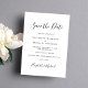 Moderno e simples salve o cartão de anúncio de data com "salve a data para nossa felicidade eterna" em uma mistura de simples tipografia e um roteiro de na moda com picos sobre sua foto. Adicione seus nomes, data e local. No verso, você pode fornecer mais detalhes e adicionar seus nomes em um script semelhante a assinatura.
