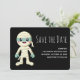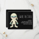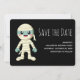 Salve o cartão de data com uma imagem legal do Dia das Bruxas. Uma múmia enrolada em suas ligaduras. Feliz rosto sorridente. Uma criatura adorável e fofa.