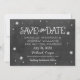 Combinação Feliz cartão com fotos de Natal de "O Futuro Sr. e Sra." e salve o cartão de anúncio de data (detalhes no verso) contém um roteiro branco manuscrito / design de giz branco com a aparência preta de fundo do quadro negro na parte de trás do cartão. Acentos de estrelas e flocos de neve. Personalize com sua foto e texto personalizado.
