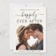 Anúncio de casamento de creme leve moderno. A frente apresenta sua foto, "Salvar a data para nossa felicidade eterna" em uma mistura de simples tipografia e um roteiro de chic com baloiços e seus primeiros nomes e data de casamento juntos por um coração. No verso, personalize os detalhes da data e adicione seus nomes em um script semelhante a assinatura.