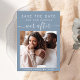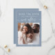 Casamento azul empoeirado de chic salve o anúncio de data com sua foto, "Salve a data para nossa felicidade eterna" em uma mistura de simples tipografia branca e um roteiro de caligrafia branca com baloiços e seus primeiros nomes e data de casamento juntos por um coração. No verso, personalize seus detalhes de salvar a data e adicione seus nomes em um script semelhante a assinatura.