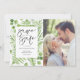 Anuncie sua data de casamento com este verde. Guarde a data do plano. Apresenta a ilustração aquosa dos furos e do quadro de eucalipto e escrita manuscrita. Personalize mudando nomes, casamento, data, local de casamento e foto. A aquarela salva o anúncio da data será perfeita para o tema do casamento verde e as estações de primavera e de verão. Disponível como cartão postal, cartão plano e cartão magnético.