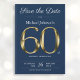 Marinho Dourado clássico Blue 60th Festa de aniversário Salvar a data. Aniversário simples, mas clássico, salve o cartão de data com o marco do ano de nascimento com efeito de texto em ouro sólido! Este é um modelo editável e poderia ser usado tanto para homens quanto para mulheres. Contacte-me se tiver alguma pergunta, farei o meu melhor para ajudar!