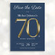 Festa de aniversário azul 70 Marinho Dourada clássica Salve a data. Aniversário simples, mas clássico, salve o cartão de data com o marco do ano de nascimento com efeito de texto em ouro sólido! Este é um modelo editável e poderia ser usado tanto para homens quanto para mulheres. Contacte-me se tiver alguma pergunta, farei o meu melhor para ajudar!