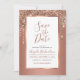 Convide-os a guardar a data para a sua festa de aniversário com estes belos cartões salve a data. Este elegante design apresenta rosa dourado e cinza de texto dentro de um elegante quadro metálico de cobre rosa dourado, com gotas de brilho e um fundo de cobre rosa dourado na frente e no verso da placa.